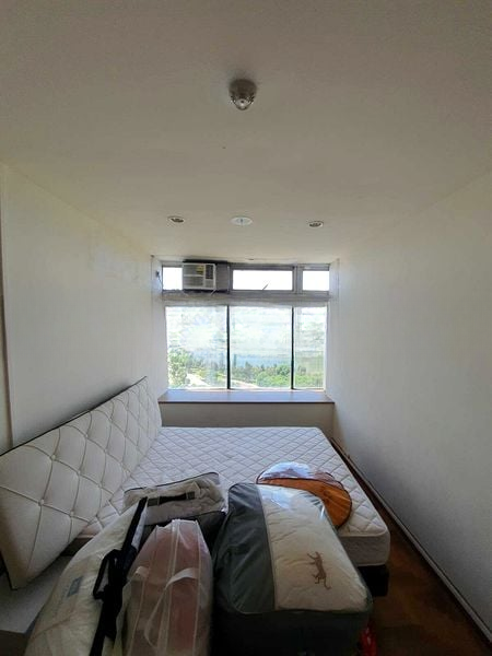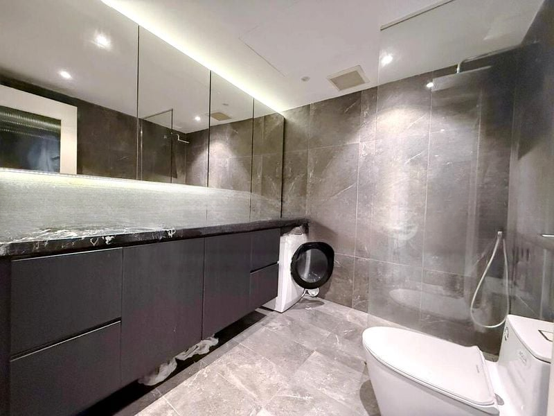 This well-maintained 1-bedroom condo features an open concept layout, seamlessly connecting the kitchen and dining areas. The kitchen boasts an island dining table with bar stools, perfect for casual meals, while the bathroom impresses with floor-to-ceiling dark grey tiles, a luxurious rain shower, and a stylish vessel sink on a black vanity. The bedroom is thoughtfully designed with a study desk, built-in wardrobe, and large windows that frame the scenic views.