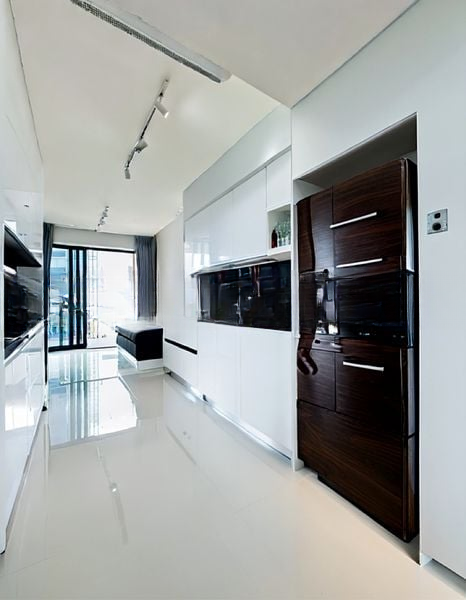 This efficient 1-bedroom plus study layout is designed for modern living, featuring a dedicated study nook perfect for remote work. The kitchen boasts sleek grey cabinetry, integrated appliances, and a chic marble-look backsplash, while the bedroom offers a cozy retreat with wood-look laminate flooring and black-framed windows. The bathroom is a sanctuary of style, complete with a glass shower enclosure and textured grey wall tiles, ensuring both functionality and aesthetics.