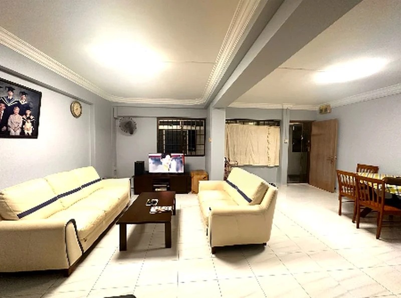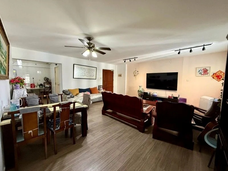 Step into a functional and lived-in space where natural light filters through, illuminating the spacious living area adorned with a striking purple accent wall. The unblocked views of the expansive green field and distant residential blocks create a serene ambiance, making this home a peaceful retreat amidst the urban landscape.
