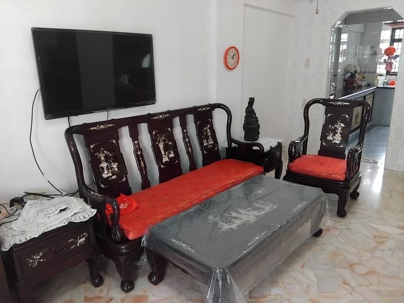 Step into this well-maintained HDB flat and be greeted by the warmth of traditional Chinese rosewood furniture, beautifully complemented by mother-of-pearl inlays. The moderate natural light filters through large windows, creating an inviting ambiance that feels both functional and homely. The marble-patterned floor tiles add a touch of elegance, while extensive floor-to-ceiling built-in storage ensures practicality without compromising style.
