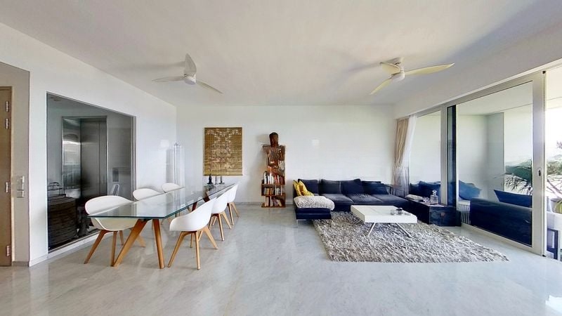 This spacious 4-bedroom, 4-bathroom unit boasts standout features including a modern island kitchen with built-in oven and sleek grey cabinetry, seamlessly integrated with the dining area. The living room, adorned with designer furnishings and ceiling fans, flows effortlessly onto a generous balcony with composite decking, perfect for enjoying the serene views. Each bedroom offers a minimalist design with light wood flooring and direct balcony access, ensuring comfort and style throughout.