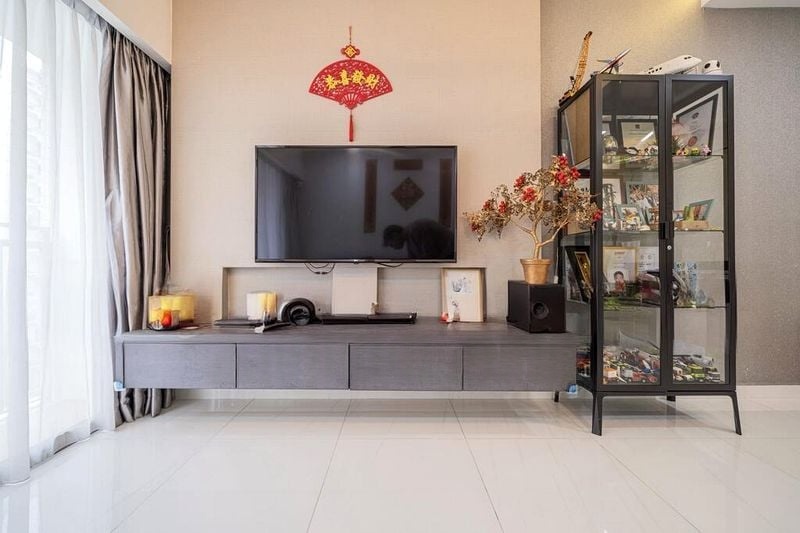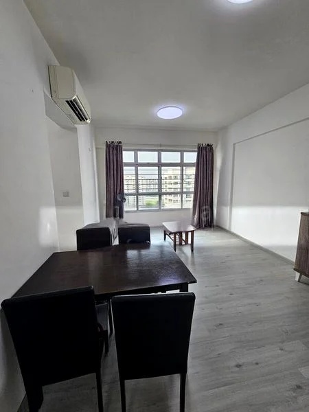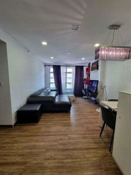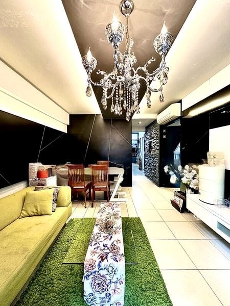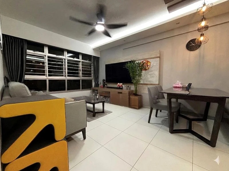 Step into this beautifully renovated HDB flat and be greeted by an abundance of natural light that floods the spacious living area. The bright and airy ambiance is complemented by large windows adorned with sheer curtains, offering serene views of neighboring greenery. The stylish finishes, including a false ceiling with cove lighting and track lighting, create a warm and inviting atmosphere that feels like home.