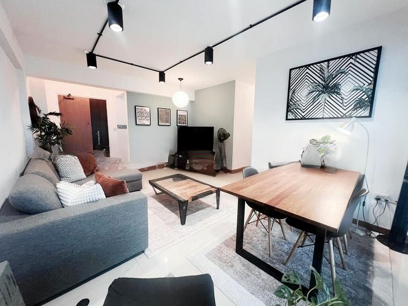 Step into a beautifully renovated 2-bedroom flat where modern minimalism meets abundant natural light. The inviting living room features a sleek leather sofa and a stylish wooden TV console, complemented by zebra blinds that frame the urban skyline views. Tiled flooring enhances the spacious ambiance, making it perfect for relaxation or entertaining.