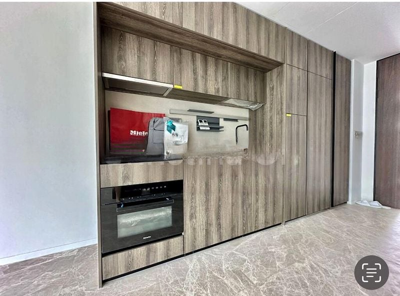 This thoughtfully designed 1-bedroom unit features a minimalist aesthetic with extensive built-in cabinetry and a sleek kitchen equipped with integrated Miele appliances. The spacious bedroom boasts a large window with frosted privacy film, ensuring a peaceful retreat. Every corner of this home reflects a commitment to quality and modern living, making it a perfect sanctuary for the discerning buyer.
