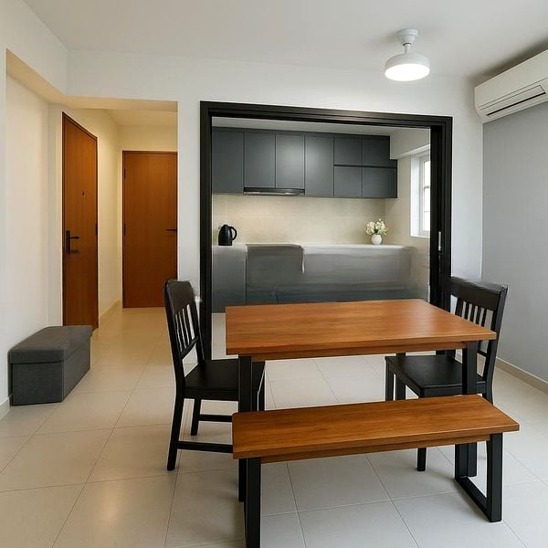 Step into a world of modern elegance as you enter this beautifully renovated HDB flat. The abundant natural light floods the living space, highlighting the polished tile flooring and the custom wood-grain TV feature wall. The recessed ceiling with cove lighting creates an inviting ambiance, perfect for relaxation or entertaining. Enjoy urban views from the large window, enhancing the overall appeal of this stylish home.
