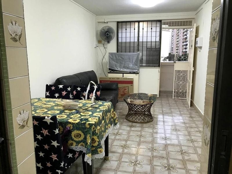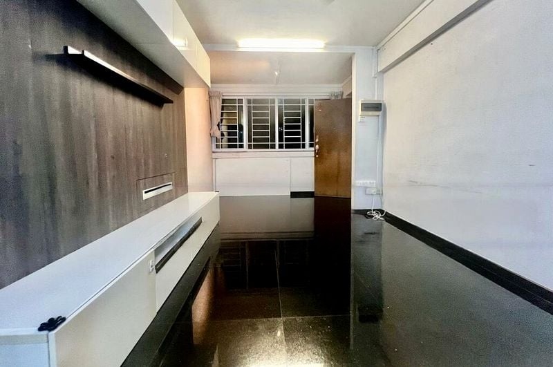 Step into a serene oasis where modern minimalist design meets comfort. This well-maintained 3-bedroom flat greets you with polished black floor tiles that reflect natural light, creating an inviting ambiance. The open concept living and dining area, adorned with a stylish built-in TV console and wood-grain backing, offers a seamless flow that enhances the spacious feel while providing views of lush greenery outside.