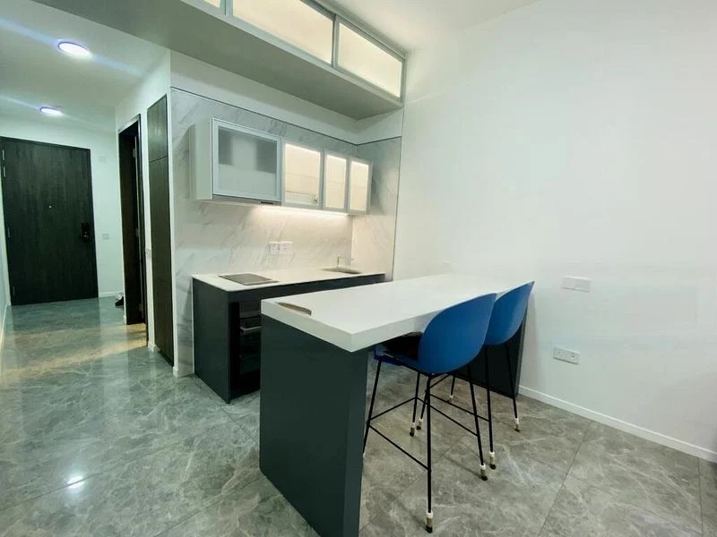The open-concept layout seamlessly connects the living room to the kitchenette, featuring integrated appliances and dark wood cabinetry. Enjoy the comfort of a spacious living area with balcony access, perfect for unwinding after a long day. The bedroom boasts an upholstered headboard and a decorative clover mirror, enhancing the minimalist aesthetic throughout.