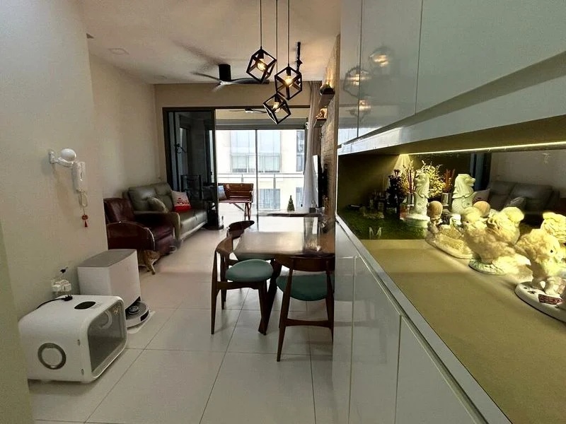 Step into this beautifully renovated 2-bedroom unit at The Miltonia Residences, where a warm ambiance greets you with its inviting white brick feature wall and floating TV console. The open-concept living area is bathed in natural light, complemented by geometric pendant lighting and large mirrors that enhance the sense of space. Enjoy cozy evenings on the wooden balcony decking, perfect for relaxation.