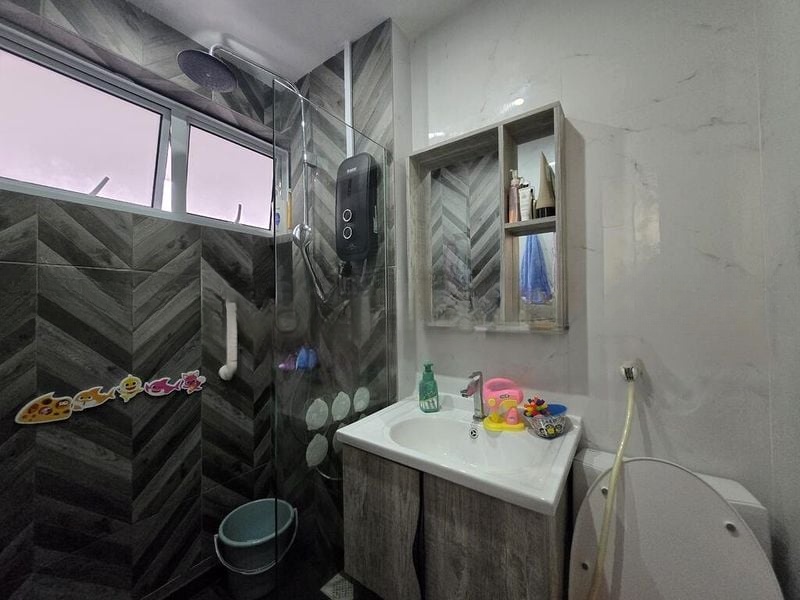 Step into this beautifully renovated HDB flat and be greeted by a modern and cozy ambiance, accentuated by a stunning white brick feature wall and stylish track lighting. The open concept living area invites natural light, creating a warm atmosphere that is perfect for relaxation or entertaining. Enjoy urban views of the surrounding HDB blocks and cityscape from the comfort of your home.