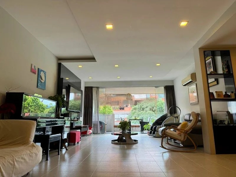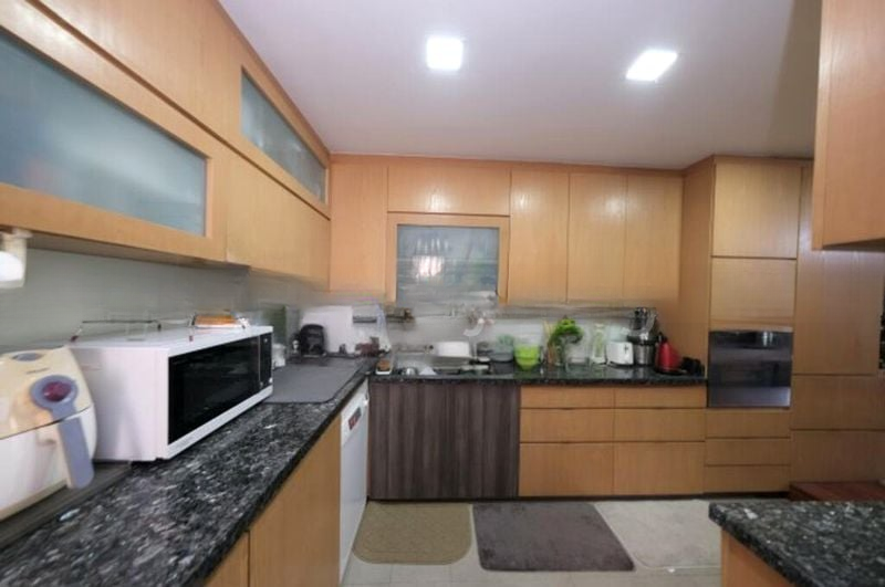This well-maintained unit features three spacious bedrooms, each equipped with built-in wardrobes and ceiling fans. The master bedroom boasts a large dark wood wardrobe and a TV console, while the bathroom offers a luxurious bathtub and stylish two-tone wall tiles. The kitchen is a chef's delight, showcasing dark granite countertops, extensive cabinetry, and modern appliances including a built-in oven, microwave, and air fryer.