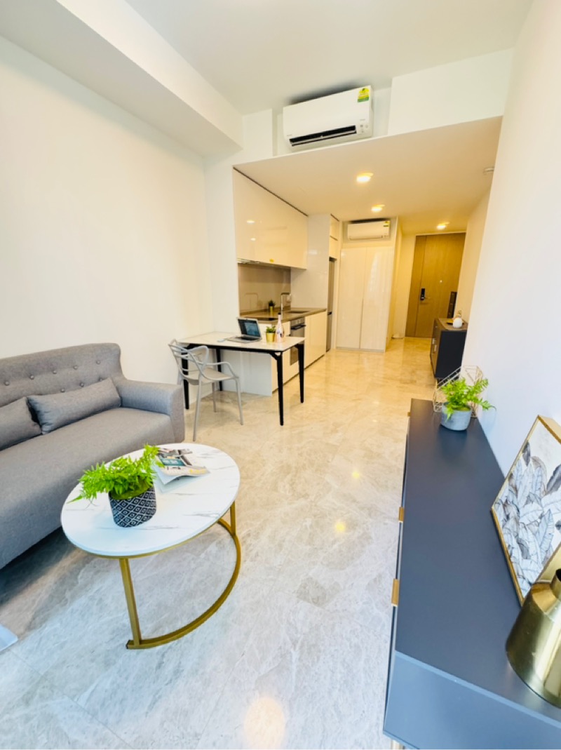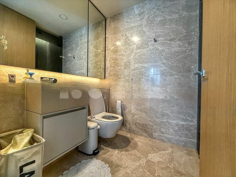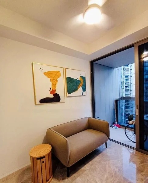 Step into this brand-new unit at Amber Park and be greeted by an abundance of natural light pouring through the floor-to-ceiling sliding glass doors. The modern minimalist design is accentuated by elegant marble-look flooring, creating a seamless flow from the open-concept living room to the inviting balcony with a serene pool view. The ambiance is both refreshing and sophisticated, perfect for relaxation or entertaining guests.