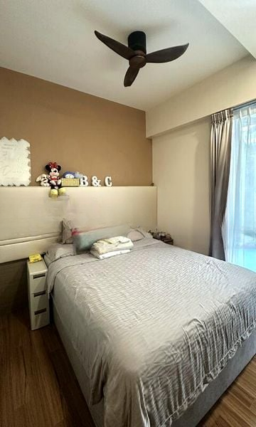 Step into a sun-drenched sanctuary where abundant natural light dances across polished floor tiles, creating a warm and inviting ambiance. The open-concept living area seamlessly connects to a spacious balcony through elegant glass sliding doors, offering serene views of neighboring greenery and residential landscapes. The decorative wall mural adds a unique touch, enhancing the overall charm of this well-maintained unit.