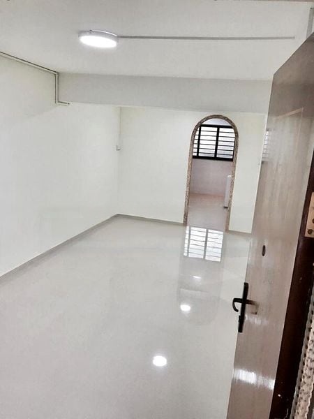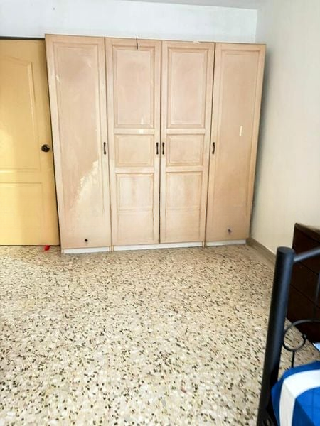 Step into this inviting 2-bedroom flat, where classic terrazzo flooring greets you with a sense of nostalgia. The light blue walls and colorful string curtain room dividers create a warm ambiance, while the moderate natural light filters through, highlighting the unique character of each space. Enjoy views of lush greenery from your living area, making it a serene retreat in the bustling city.