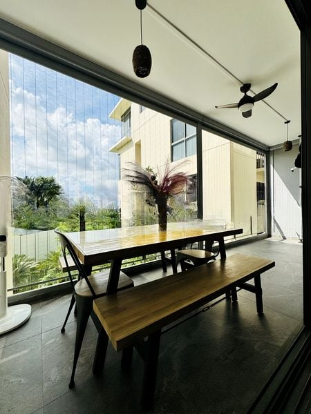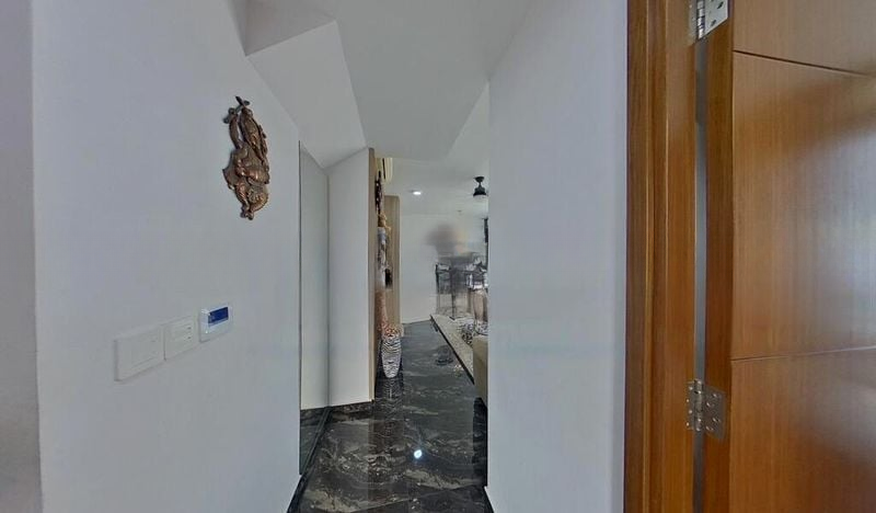 Step into this beautifully renovated unit at The Miltonia Residences, where abundant natural light floods the space through floor-to-ceiling windows, creating a bright and airy ambiance. The living room features elegant wooden flooring and a striking stone-textured accent wall, complemented by a false ceiling with cove lighting that enhances the overall aesthetic.