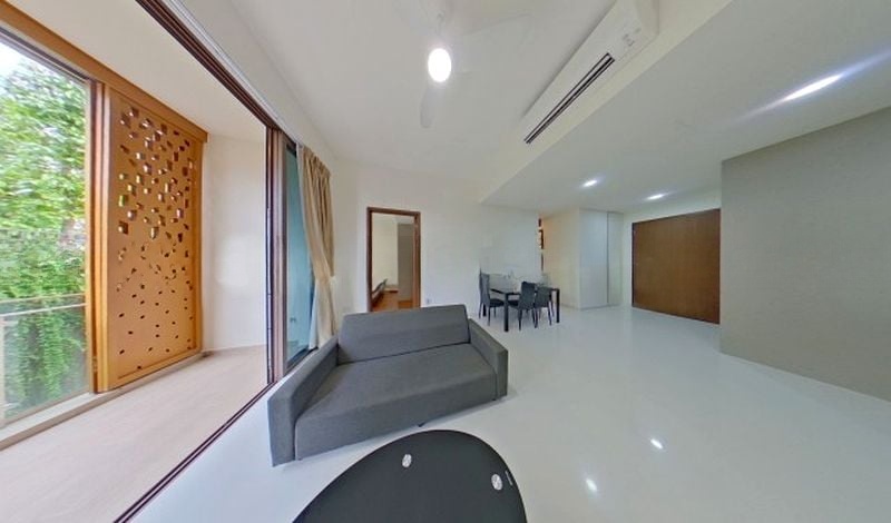 Step into a brand-new sanctuary where abundant natural light floods through large glass sliding doors, illuminating the polished tile flooring and enhancing the airy ambiance. The modern minimalist design is complemented by decorative privacy screens and views of lush greenery, creating a serene escape from the hustle and bustle of city life.