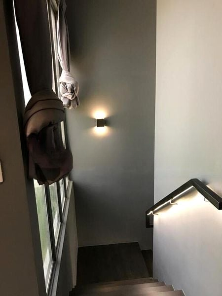 Step into a world of sophistication as you enter this beautifully renovated unit at RV EDGE. The moody ambiance is accentuated by designer finishes, including a striking black mosaic feature wall and an illuminated staircase handrail that guides you through the space. Natural light may be limited, but the thoughtful design creates a warm and inviting atmosphere that feels both modern and luxurious.