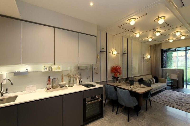 This efficient 2-bedroom plus study layout boasts standout features including a sleek open kitchen with integrated appliances, a spacious living room with high ceiling potential, and a dining area enhanced by designer pendant lighting. The frosted glass cabinetry with internal lighting adds a touch of elegance, while the dedicated study nook provides a perfect space for productivity amidst the luxury.