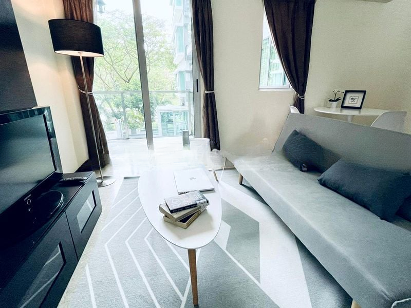 Step into a world of modern elegance as you enter this beautifully renovated unit at Mackenzie 88. Bathed in abundant natural light, the open-concept living area features sleek tiled flooring and modern pendant lighting, creating an inviting ambiance. Enjoy serene views of the pool and lush greenery from the glass-railed balcony, perfect for unwinding after a long day.
