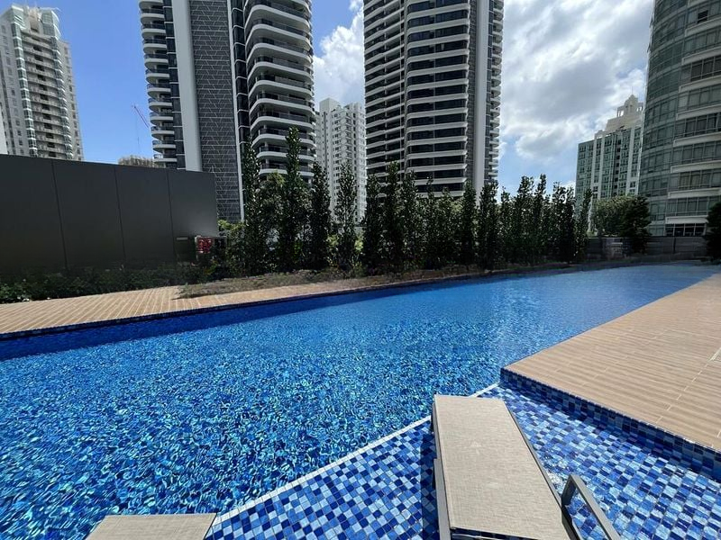 Step into a world of modern elegance as you enter this brand-new unit at Pullman Residences Newton. The abundant natural light floods the open-plan living area, highlighting the polished stone flooring and white walls that create a serene ambiance. Floor-to-ceiling balcony doors invite you to enjoy breathtaking views of the expansive swimming pool, city skyline, and lush greenery, making every moment spent here a visual delight.