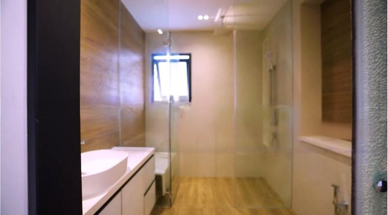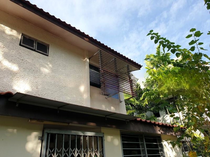 Step into a serene retreat where polished stone flooring greets you, enhancing the cozy ambiance of this well-maintained two-story landed property. The arched doorway leads you to a spacious living area bathed in natural light, framed by glass partitions that offer views of the lush greenery and your expansive private garden. The traditional wooden window louvers and textured facade add character, creating a warm and inviting atmosphere.