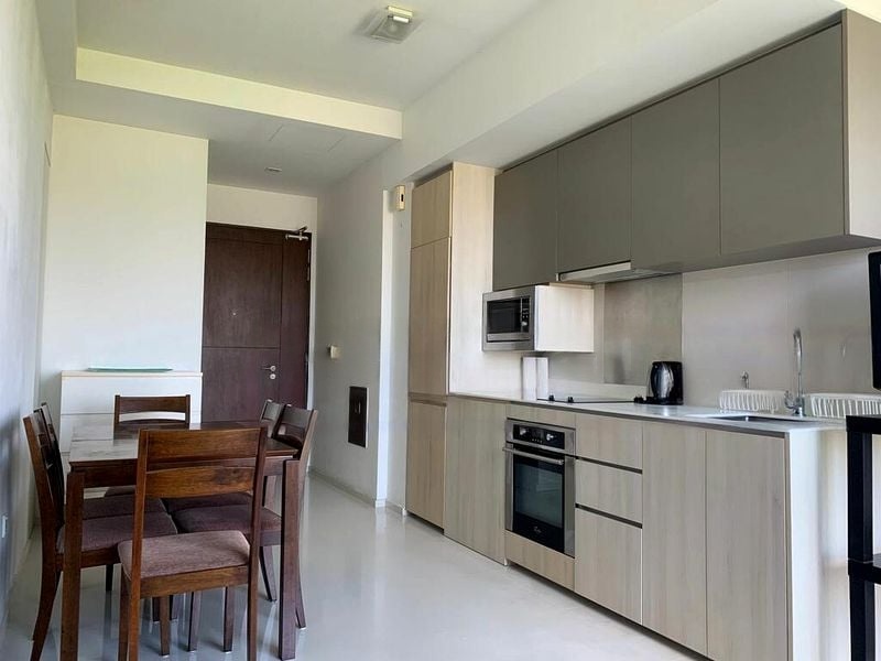 This well-maintained 1-bedroom unit features an open-plan layout that seamlessly connects the living, dining, and kitchen areas. The fully-furnished living room boasts a dark grey sofa and direct access to the balcony, while the kitchen is equipped with integrated appliances, including an oven and induction cooktop, complemented by stylish two-tone cabinetry. The bedroom offers a cozy retreat with sliding glass wardrobes and open shelving units, enhancing both functionality and style.