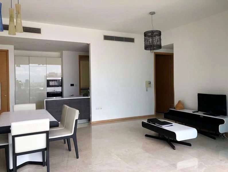 Step into a bright and airy sanctuary at Martin Place Residences, where abundant natural light floods through floor-to-ceiling windows, showcasing breathtaking views of the city skyline and Singapore Flyer. The spacious balcony invites you to unwind outdoors, while the marble flooring enhances the elegance of the living area, creating an inviting atmosphere.