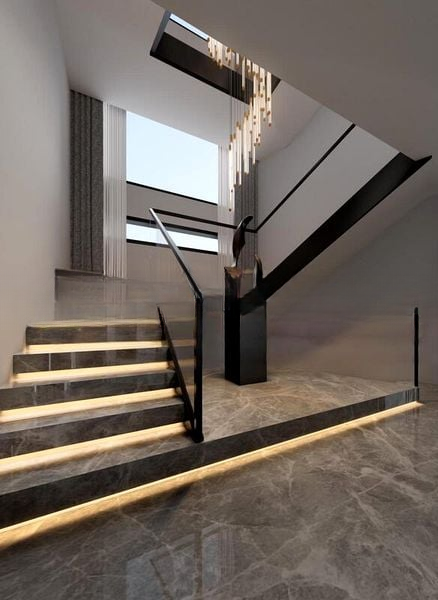 This impressive residence boasts six spacious bedrooms and seven bathrooms, perfect for families seeking comfort and sophistication. The open-concept living and dining areas feature designer furniture and stunning chandeliers, while the island kitchen is a culinary dream with dark cabinetry and integrated storage. The entertainment room, complete with a pool table and track lighting, is ideal for hosting gatherings, while the marble-tread staircase with integrated LED lighting adds a touch of modern flair.