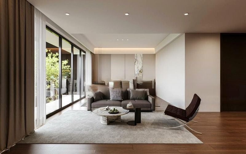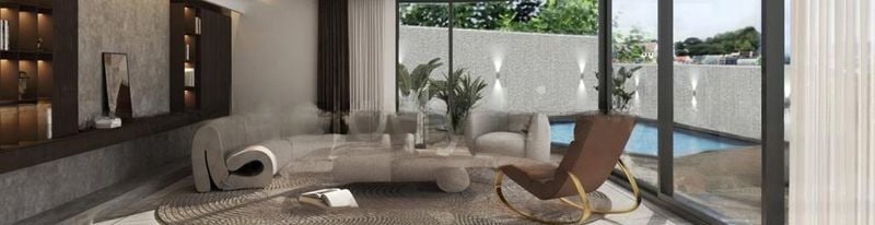 Step into a world of elegance as you enter this brand-new designer home, where abundant natural light floods the space through floor-to-ceiling glass doors. The modern minimalist ambiance is accentuated by exquisite marble flooring and geometric architectural details, creating a serene yet luxurious atmosphere. Enjoy picturesque views of the pool and lush greenery from every angle, inviting you to unwind in style.