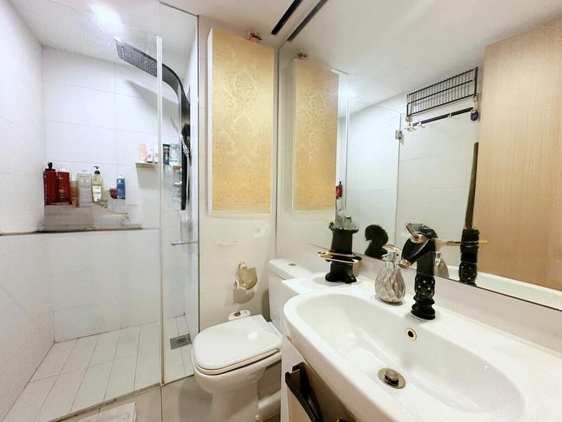 This well-maintained unit features a modern kitchen equipped with integrated appliances, including a built-in oven and induction hob, complemented by a stylish peninsula breakfast bar. The bedroom offers a cozy haven with wood-look laminate flooring, a built-in wardrobe with sliding frosted glass doors, and a split-unit air conditioning system for comfort. The bathroom showcases contemporary finishes with a glass shower partition and a sleek white vanity cabinet.