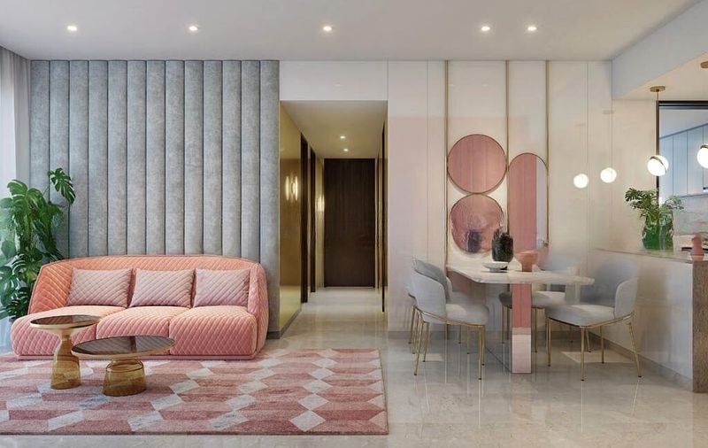 The efficient layout maximizes space, with a linear kitchen showcasing integrated appliances and dual-tone cabinetry that blends functionality with style. The bedroom is a serene retreat, adorned with light wood laminate flooring and large windows that create a bright and airy atmosphere. The bathroom impresses with a luxurious rain shower, wall-hung toilet, and a dark stone-look vanity top, perfect for unwinding after a long day.