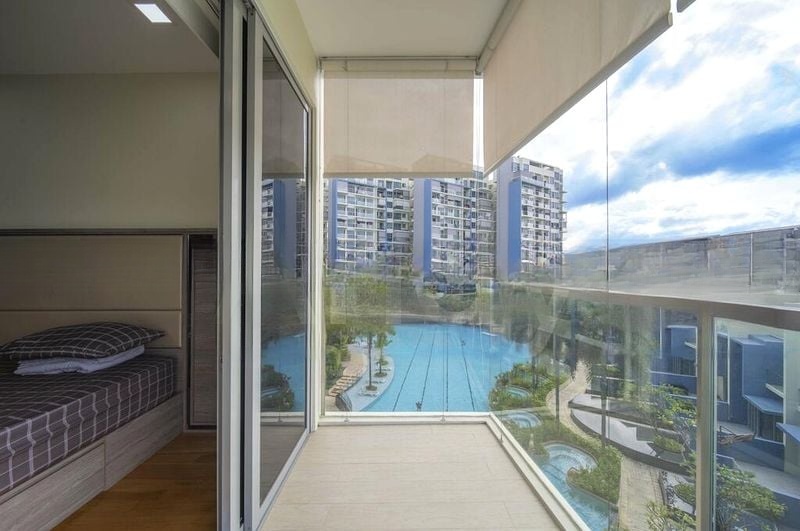 Step into this beautifully renovated unit at Skies Miltonia, where abundant natural light floods the space, accentuating the modern minimalist design. The inviting ambiance is enhanced by a stunning pool view from the balcony, framed by glass railings and outdoor roller blinds, creating a serene retreat amidst lush greenery.