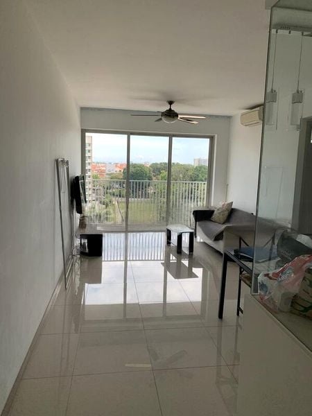 Step into a bright and airy sanctuary at OPTIMA @ TANAH MERAH, where abundant natural light floods the open-concept living and dining area, accentuated by a light blue feature wall and elegant pendant lighting. The inviting ambiance is complemented by views of the urban landscape, creating a serene escape amidst the city bustle.