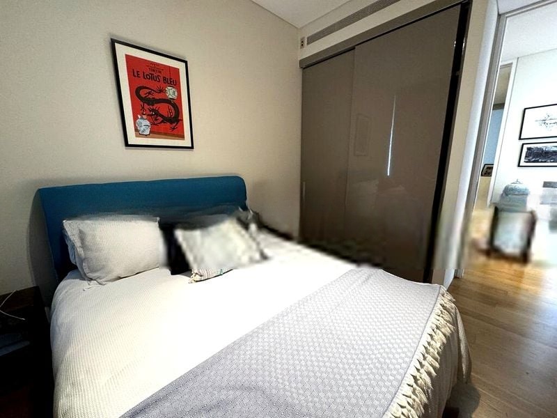 This well-maintained unit features three spacious bedrooms and three bathrooms, each thoughtfully designed for comfort and elegance. The island kitchen boasts white cabinetry and built-in appliances, perfect for culinary enthusiasts. Integrated bookshelves add a touch of character, while the balcony offers an unobstructed view of the skyline, making it an ideal spot for relaxation. The communal swimming pool and lounge area further enhance the luxurious lifestyle.