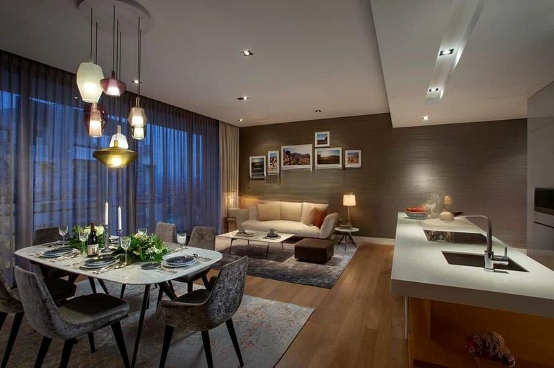 Step into a realm of modern luxury where abundant natural light dances across the open-concept living space, highlighting exquisite finishes and designer touches. The panoramic views of the city skyline, including the iconic Marina Bay Sands, create an inviting ambiance that is both sophisticated and serene. The living room, adorned with wooden flooring and a stylish leather sofa, seamlessly flows into the dining area, where a stunning marble dining table awaits.
