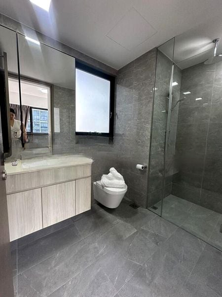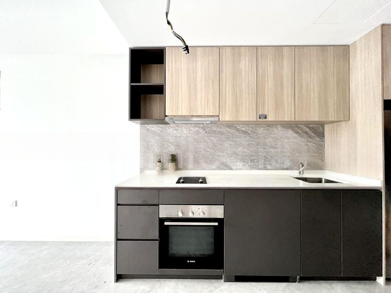 This efficient 2-bedroom + study layout features a luxurious en-suite master bedroom with wood flooring and blackout curtains, ensuring restful nights. The second bedroom is equally inviting, while the dedicated study room provides an ideal workspace bathed in natural light. The kitchen is a culinary delight, equipped with an induction hob, built-in oven, and stylish two-tone cabinetry, perfect for both cooking and entertaining.