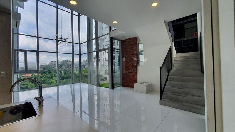 Step into a world of elegance as you enter this beautifully renovated unit at Draycott Eight. The abundant natural light floods the space through floor-to-ceiling windows, showcasing breathtaking views of the city skyline and lush greenery. Polished marble flooring adds a touch of luxury, while the designer pendant light creates an inviting ambiance that feels both bright and airy.