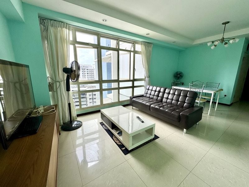 Step into a well-maintained 3-bedroom flat that exudes a warm and inviting ambiance. The open-concept living room, adorned with light-colored floor tiles and a ceiling fan, welcomes you with moderate natural light filtering through large windows. The extensive overhead storage cabinets add to the practicality, while the L-shaped kitchen, featuring dark wood-grain cabinetry and white countertops, is both stylish and functional, perfect for culinary enthusiasts.