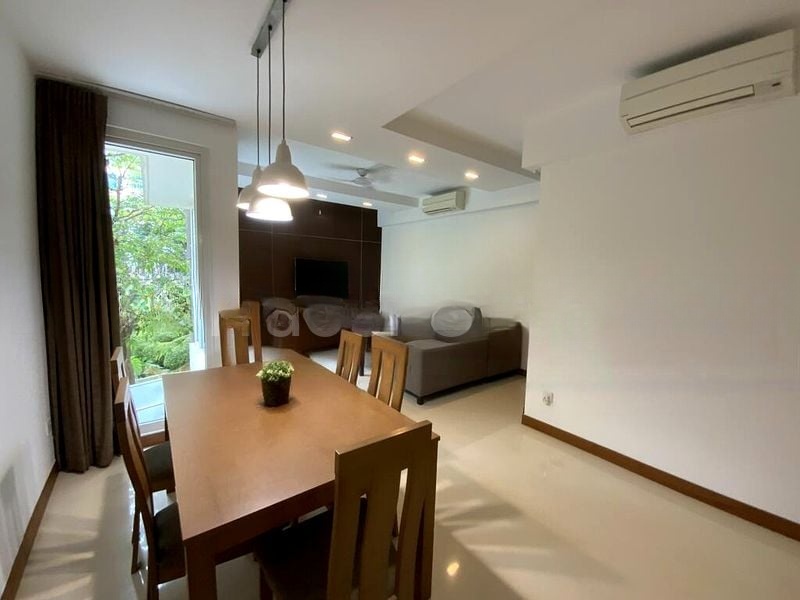 Step into a warm and inviting space where dark wood feature walls and pendant lighting create a cozy ambiance. The open-concept living and dining area is bathed in natural light, thanks to large windows adorned with full-length curtains, offering serene views of lush greenery and neighboring buildings.