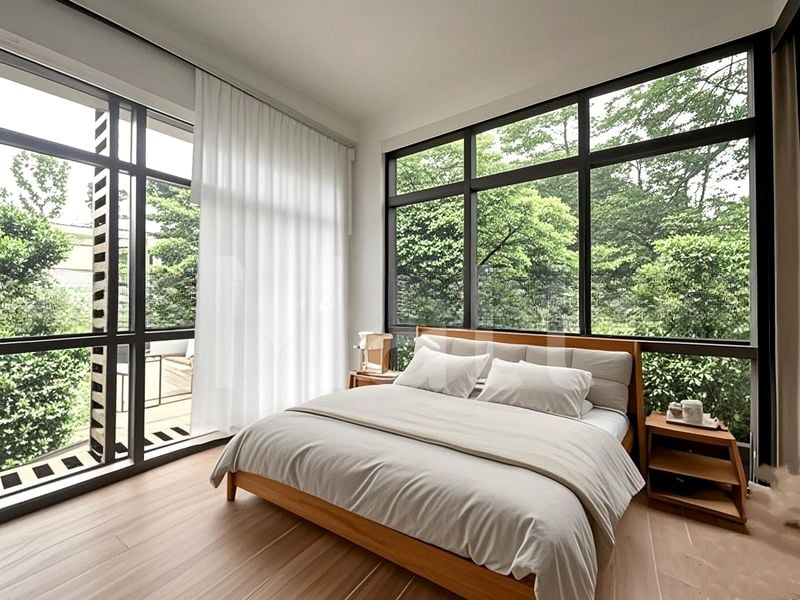 This well-maintained 2-bedroom unit features an open concept layout that seamlessly connects the living space to the balcony, perfect for entertaining or simply enjoying the serene outdoor view. The kitchen boasts dark wood grain cabinetry and sleek black stone countertops, complemented by an integrated kitchen island for added convenience. Each bedroom is fitted with wooden flooring and large windows, creating a cozy retreat with built-in wardrobes and air conditioning for comfort.