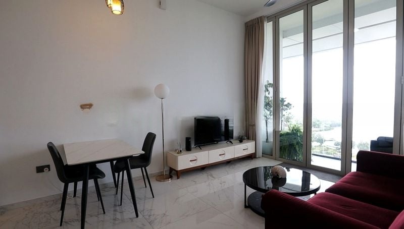 Step into a world of elegance where abundant natural light floods the space, highlighting the polished marble flooring and the stunning floor-to-ceiling windows. The open concept design creates a seamless flow between the living area and the private balcony, offering unblocked views of the river, city skyline, and lush greenery that envelops your home in tranquility.