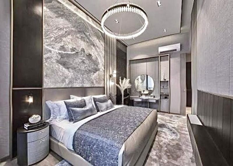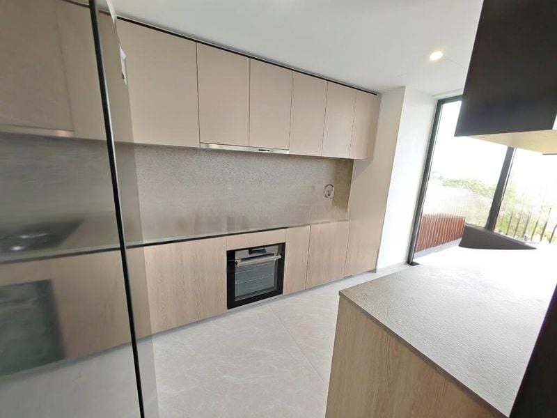 This spacious 4-bedroom unit features a well-designed layout, with a contemporary kitchen boasting light wood cabinetry, grey stone countertops, and built-in appliances. The living room, adorned with modern pendant lighting, offers direct access to the balcony, perfect for entertaining. The bedrooms are fitted with wood-look laminate flooring and large windows, while the bathrooms showcase luxurious finishes, including a rain shower and integrated shelving for added convenience.