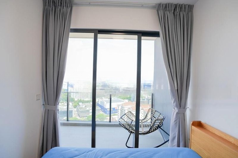 Step into a world of modern elegance as you enter this beautifully designed 1-bedroom unit at Stirling Residences. The abundant natural light floods the open living area, highlighting the sleek finishes and creating an inviting ambiance. The striking wood-slat feature wall and large aquarium serve as focal points, while the balcony offers a serene escape with its wood decking and vertical garden, perfect for unwinding while enjoying unobstructed views of the city skyline.