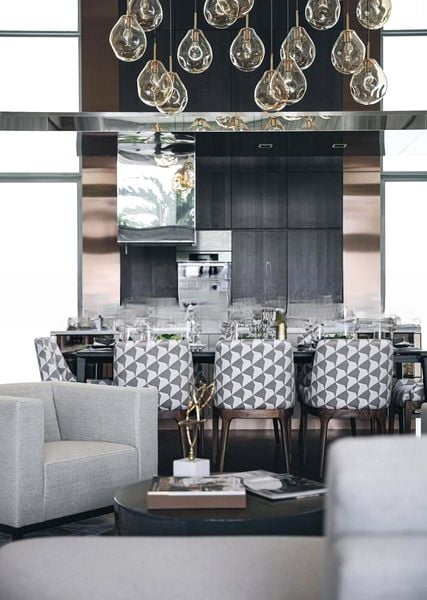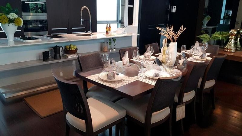 This expansive 5-bedroom, 4-bathroom unit offers a seamless flow between spaces, featuring a large kitchen island with white stone countertops, integrated appliances, and dark minimalist cabinetry. The dining area is perfect for entertaining, adorned with a stylish designer lighting fixture and patterned upholstered chairs. Each bedroom is a retreat, showcasing custom geometric padded headboards and built-in window benches that enhance comfort and style.