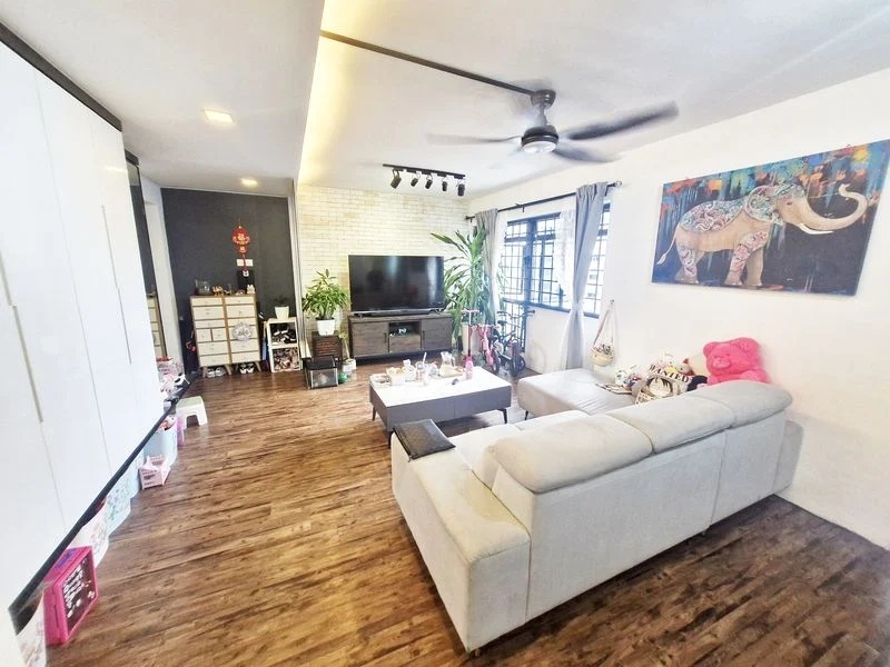 Step into this beautifully renovated HDB flat and be greeted by a stunning brick-patterned feature wall that adds character to the living space. The moderate natural light filters through, enhancing the modern ambiance created by the wood-look laminate flooring and stylish track lighting. The large wall mirror with LED border in the dining area reflects elegance, making the space feel even more expansive.