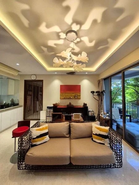 Step into this beautifully renovated 3-bedroom unit at Archipelago, where abundant natural light floods the open-concept living space, accentuating the modern finishes and cozy ambiance. The designer chandelier casts intricate shadow patterns, while the unique woven sofa invites relaxation. Enjoy seamless access to the balcony, perfect for unwinding amidst the greenery and residential views.