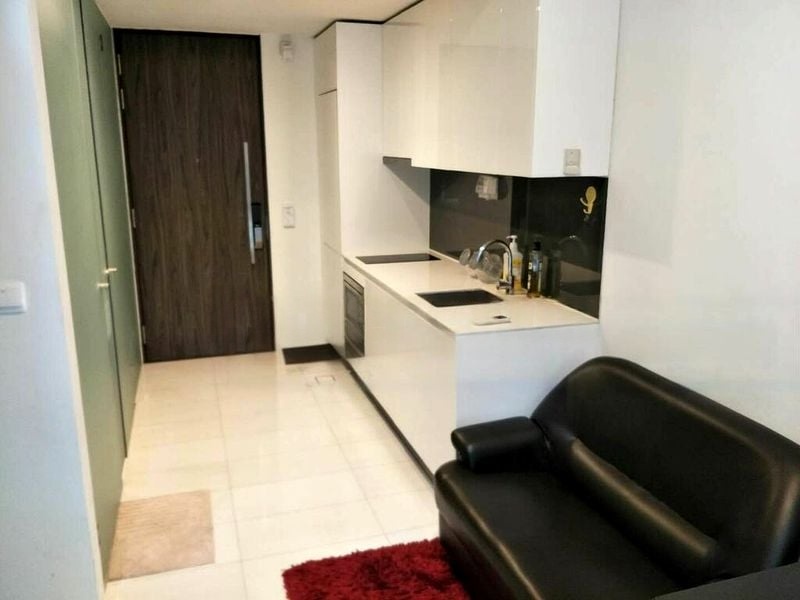 Step into a world of modern minimalism as you enter this beautifully renovated loft-style unit at Metro Loft. The open-plan living area greets you with a compact yet inviting layout, featuring a sleek black leather sofa and a vibrant red shaggy rug that adds warmth to the white tiled flooring. Natural light filters through, enhancing the ambiance and highlighting the quality finishes throughout.