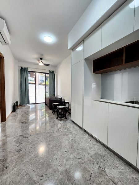This thoughtfully designed 2-bedroom unit features standout elements such as a breakfast bar with a luxurious marble top, integrated carpentry lighting, and a custom curved wooden display cabinet. The living and dining area flows seamlessly, perfect for entertaining, while the bedrooms offer built-in desks and ample storage with sliding wardrobes. Every detail, from the designer track lighting to the wooden wall paneling, speaks to quality and sophistication.