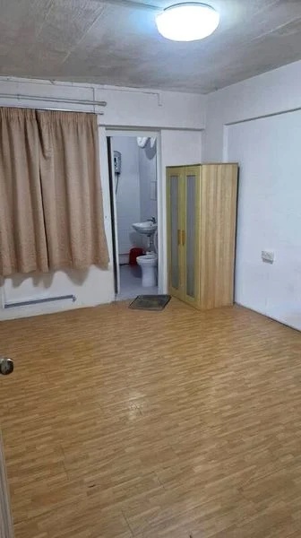 This unit features a spacious living area, a cozy dining space with a wooden table, and a well-equipped kitchen with an L-shaped layout and built-in gas hob. The bedrooms boast wooden flooring, complete with a standalone wardrobe and a dressing table, ensuring both style and practicality. The bathroom, with its tiled walls and exposed piping, adds a unique character to the home.