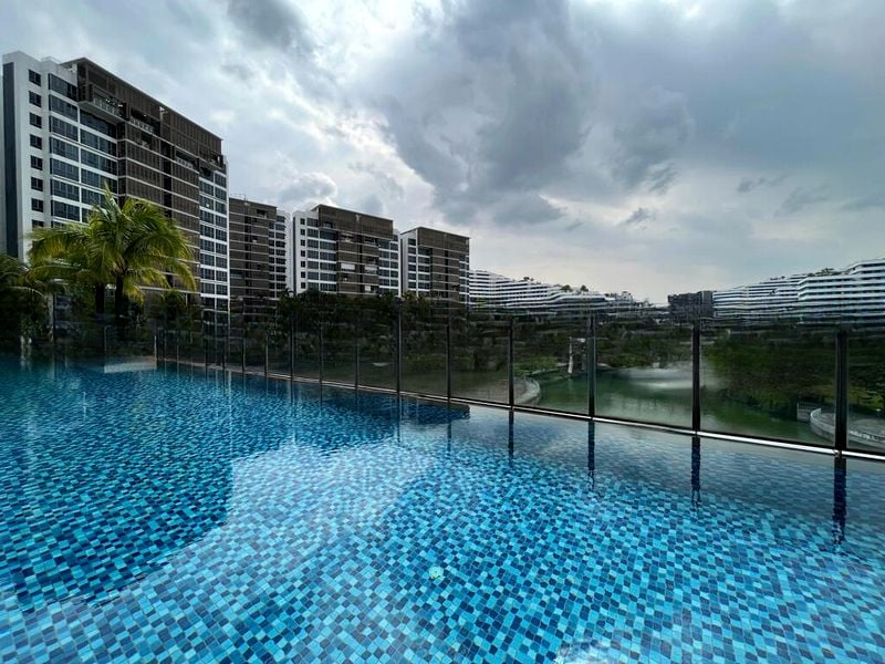 Step into a beautifully maintained 4-bedroom unit at Watertown, where the first thing that captures your attention is the breathtaking view of the infinity pool framed by lush greenery. The high ceilings and marble-look floor tiles create an inviting ambiance, while the globe pendant lights add a touch of elegance to the living space. Natural light filters through, enhancing the functional and lived-in feel of this home.