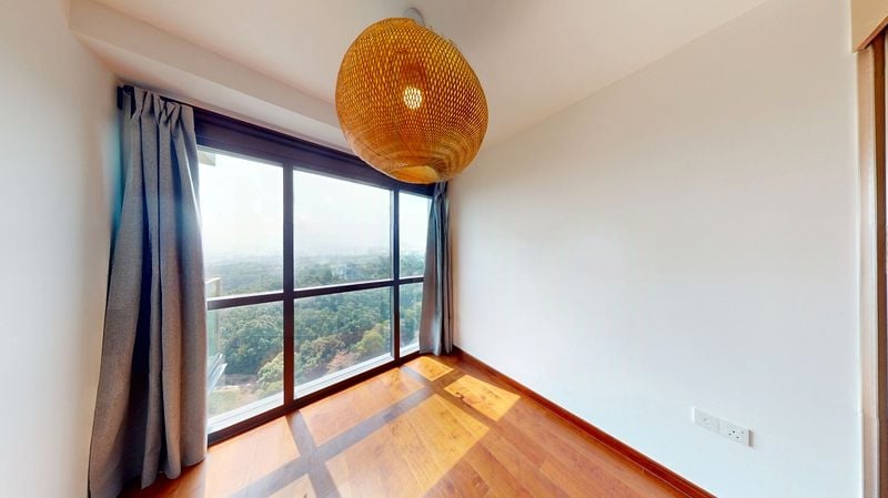 Step into this bright and airy penthouse, where abundant natural light floods through the expansive sliding glass doors, illuminating the polished tile flooring and highlighting the stunning double-volume ceiling. The modern chandelier and woven pendant light add a touch of elegance, while the panoramic views of lush greenery and a serene water body create a tranquil ambiance that invites relaxation.